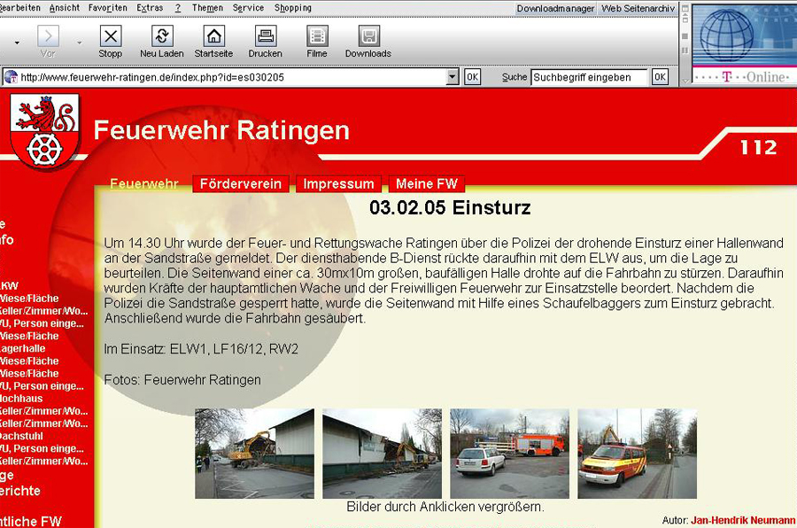 | 3.Februar 2005 Die Ratinger Feuerwehr musste die ehemalige Wagenhalle am Bahnbetriebswerk Ratingen West wegen akuter Einsturzgefahr einreissen. Das Gebäude drohte auf die Sandstrasse wegzubrechen. - Link führt heutzutage nur noch direkt zur Feuerwehr. Alte Beiträge sind scheinbar nicht mehr erreichbar. Lesbarer Screenshot >>KLICK |