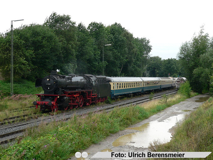 | 41 360 erreicht um 8:33 Uhr den Bahnhof Düsseldorf-Rath nachdem sie ab Düsseldorf-Derendorf über Rethel, Fortuna, Hardt und nach Durchfahrt des Staufenplatztunnels ( zur Vermeidung von Fehlalarmen beim Befahren des Tunnels mit Dampflokomotiven war die für diesen Tunnel zuständige Feuerwehr der Stadt Düsseldorf zu informieren) einen Halbkreis gefahren hat. | |