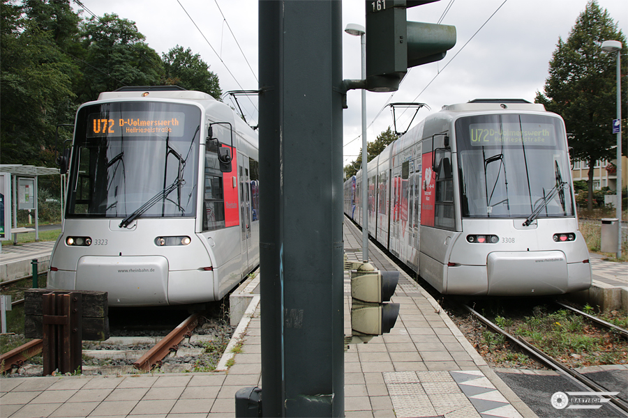 Das Richtungsgleis Düsseldorf an der Haltestelle ist frei und 3323/3330 setzten um an den regulären Bahnsteig.